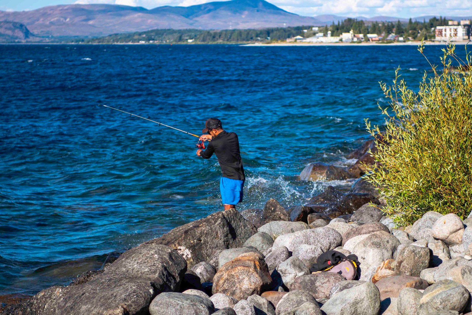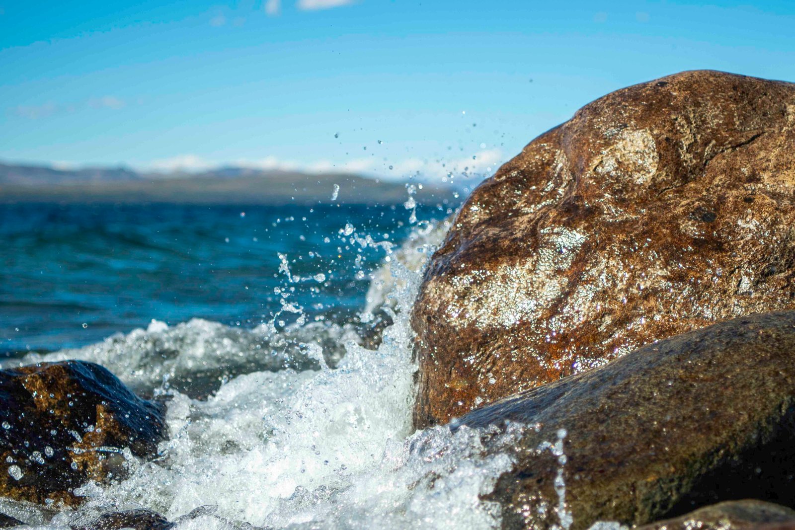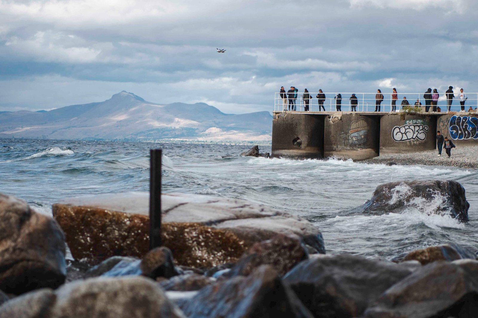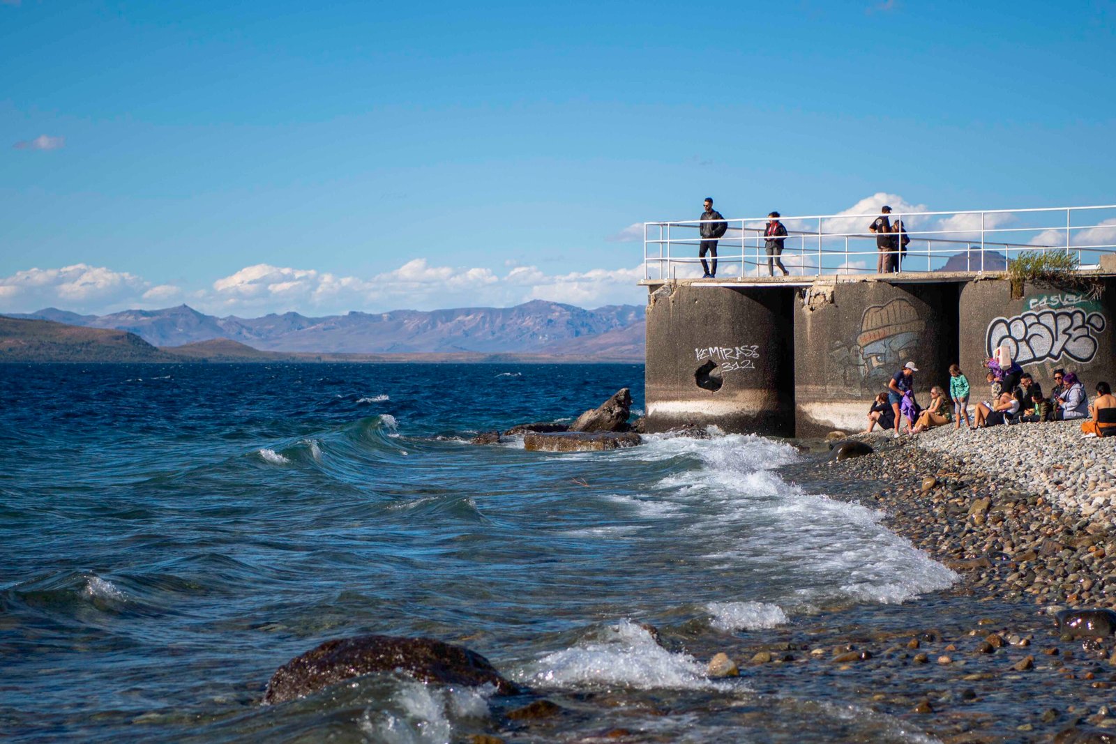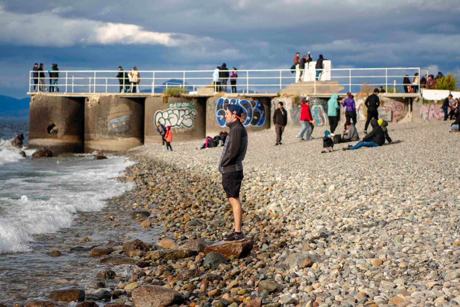 An afternoon by Lago Nahuel Huapi in Bariloche, as the summer sun blazes, and the sky stretching endlessly above. Far from deterring an afternoon by the lake, this breezy day adds an exhilarating energy to the stunning natural beauty, creating a symphony of motion and light that is simply captivating.